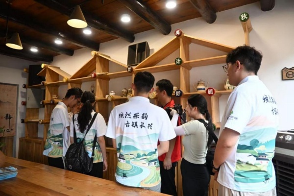 7月18日,团队正式开始了小镇的实地考察。漫步于焕古镇文化场馆,实践队在历史与现实的交融中探寻文化基因。乡贤馆内,泛黄的照片讲述着先贤济世为民的往事;家风馆中,陈列的照片诠释着"耕读传家"的百年传承,每一件展品都在无声诉说着世代相传的家训故事;古色茶室里,氤氲的紫阳茶香与淳朴乡音交织,志愿者轻抚茶盏讲述往事的画面,勾勒出最动人的乡土画卷。