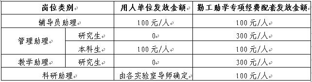 (1)学生参加勤工助学的时间原则上每周不超过8小时,每月不超过40小时。本科生勤工助学报酬的50%由勤工助学专项经费支付,标准为每人每月100元,辅导员助理和管理助理的其余劳动报酬由用人单位配套支付50%;科研助理的其余劳动报酬由各实验室导师确定,不设标准。研究生勤工助学经费支付最高标准不超过每人每月300元。