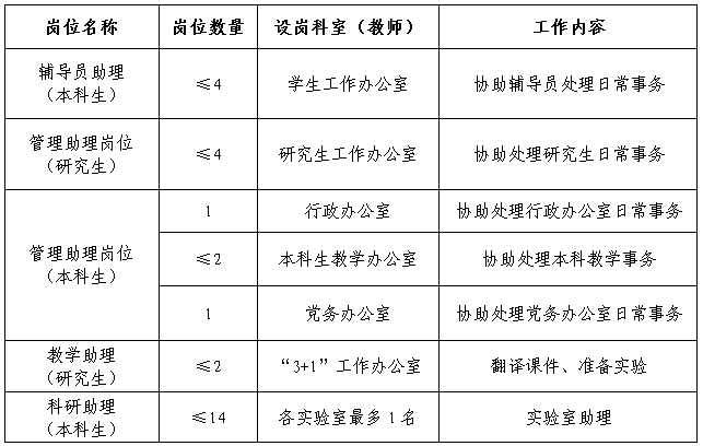(3)辅导员助理岗位按照与学生人数1:400的比例分配;研究生教学助理岗位根据部分基础课开设情况确定。