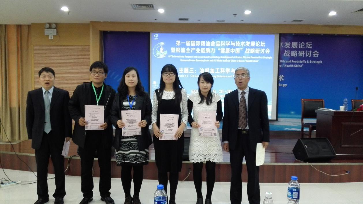 本次论坛共设置了食品加工科学与技术、粮食加工科学与技术、油料加工科学与技术、粮食储藏科学与技术4个主题会场。我校食品学院栾广忠副教授在“粮食加工科学与技术分会场”主题会场上做了“Effects of Transglutaminase on the Physicochemical Properties of Oat Dough”的主题报告, 研究生徐立荣、刘磊、周星杰和吉梦莹分别作了题为“Qualitative and Quantitative Analysis of Edible Oil by FTIR Spectroscopy Using a New Film-based Technique”、”Efficient Salt-aided Aqueous Extraction of Bitter Almond Oil and Its Mechanism”、”Effect of gelatinization degree on physicochemical properties of tartary buckwheat flour”、“添加挤压燕麦粉对小麦面团性质和面包品质的影响”的墙报展示,受到与会代表的好评,其中徐立荣、刘磊同学墙报分别获得了本届论坛最佳墙报奖二等奖和三等奖。