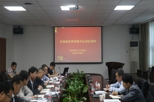 赵忠书记对学院取得的成效表示肯定,并强调食品学院党建工作及教职工理论学习的制度化、常态化与工作的规范性值得表扬。