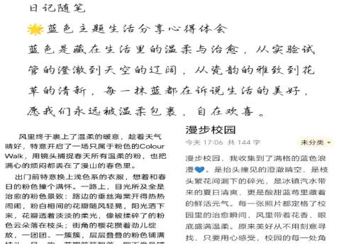 在记录与分享环节,同学们结合拍摄的照片,撰写50至100字的心情感悟,将春日美景与内心感受融为一体,线上提交图文作品。活动群内氛围热烈,大家积极分享作品、交流漫步心得,在互动中结识同好、传递温暖,以图文为纽带搭建起心灵交流的桥梁,让治愈与美好在群内持续传递。