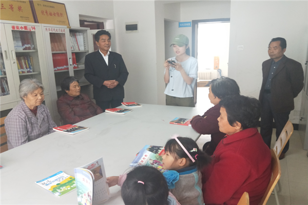 每年的4月23日是“世界读书日”,其目的是为了推动更多的人去阅读与写作,尊重和感谢为人类文明做出巨大贡献的文学大师们。俗话说“活到老,学到老”,为了培养全民阅读习惯,营造良好的阅读氛围,丰富老年人的精神文化生活并积极发挥李台村图书室的作用,李台村村主任助理常蕾和食品学院文明使者团春雨支队合作,于2019年4月21日上午九点带领4名志愿者来到了李台村,开展读书分享活动和歌颂新时代主题宣传活动。