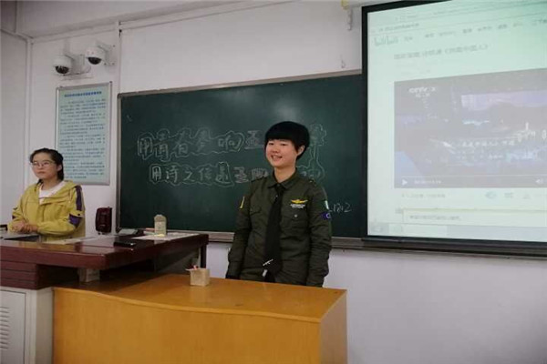 活动第一项是观看视频。视频缅怀了过去的岁月:在1919年的5月4日,为了驱逐黑暗、争取光明,为了祖国的独立和富强,一群意气风发的青年用热血和生命谱写了一曲最壮丽的青春之歌,绘就了一幅最宏伟的青春图画。如今,五四运动作为光辉的一页载入了中华民族的史册。然而,“五四运动”绝不仅仅是一个历史事件,它更是一种精神,一种伟大的“爱国主义”精神。在这种精神里,有着青年人关注国家命运的责任和使命,有着青年人振兴民族大业的赤胆与忠心。 紧接着,各个代表或推荐书籍或朗读诗文纪念五四运动,用自己的方式表达对五四的敬意,或为不经意的某一句感到震撼,或因先辈诗文感触当时热血,共同分享这份爱国精神。