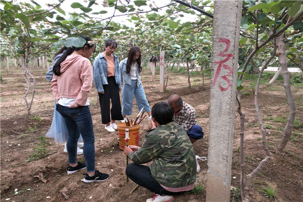 经过十分钟的车程,田园使者们一行人到达了目的地——一大片猕猴桃园。初见就震撼了队员们,亲自看到才知道猕猴桃类似于葡萄一样的有藤植物,要搭架才能完成它的使命。在简单学习授粉的方法之后,队员们便开始动手操作。学习操作的简单让队员们都跃跃欲试,信心满满。但短短的二十分钟后,大家才真正体会到田间劳作的辛苦。花朵位于头顶,大家必须仰头操作,没多久大家都脖子酸疼,而且体会到花粉飘到脸上和眼睛里的痛苦。旁边一同劳作的负责人告诉队员们:“人工花粉是由淀粉,食用色素,花粉混合而成,并且为了便于标示授粉成功和避免浪费。并且必须选择花瓣完全绽放的花授粉,否则会使结的果实会畸形,从而滞销。”有鉴于此,队员们不由得感慨授粉的艰辛,也了解到畸形果的来源。
