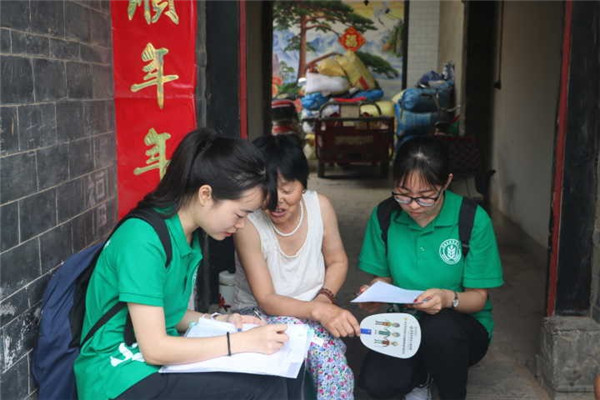 上午8时左右,队伍抵达路一村村委会,驻村第一书记马智民热情接待,将队员们稍作安顿后,随即请村会计侯树卯前来为队伍详细介绍路一村的基本情况,他全力协作,对队伍的调研工作表示大力支持。在村委会党员活动室里,陈列着一块块奖牌证书,昭示着路一村这些年来在脱贫攻坚工作方面取得的功绩。年逾七旬的侯会计如数家珍般地向队伍介绍了路一村的低保户、贫困户、脱贫户数量,提到村里返贫人数为零时,看得见他脸上难以掩饰的笑容以及深深的自豪。“习近平总书记说的好啊,脱贫攻坚‘贵在精准,重在精准,成败之举在于精准’。通过一帮一扶,发展苹果种植特色扶贫产业是村里实现贫困户摘帽的关键,今后我们村要继续完善建档立卡制度,深入推进精准施策”,候会计说。经过后续介绍队伍了解到路一村的电网升级改造、互联网覆盖已全部完成,但垃圾、污水处理设施还不够完善,还远未达到乡村振兴战略中的“生态宜居”内容。了解基本情况后,队伍出发走访村户开展实地调研,当地村民见到身穿西农队服的队员们都热情相迎,表示西农长期以来都十分关心合阳县的脱贫攻坚工作,实施了许多惠民举措,所以对来自西农的队员们都倍感亲切。在后续的调研工作中,村民们都积极配合,认真填写问卷,队员们也都送与他们队伍自制的印有食品安全知识的扇子、肥皂作为感谢。经过一上午的调研,队员们发现村内仍存在较大的问题:高成本的灌溉、施肥制约着农民的作物收成,大多只能靠天吃饭;作物销售渠道单一,滞销严重,低价贱卖;村内自来水存在较多杂质,危害村民的健康状况。队员们也向村民承诺定会认真撰写实践报告,如实反映这些问题。