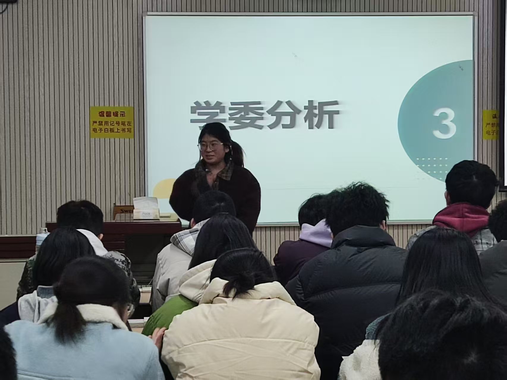 学习委员王洋、孙锦涛在发言中,着重介绍本学期的学习计划和安排。细致讲解课程预习、复习的实用方法,帮助同学们更好地掌握专业知识,学委还特别呼吁同学们在学习过程中互帮互助,组建学习小组,营造浓厚的学习氛围。团支书王静怡则从班级团建、思想建设等方面进行总结。回顾过去,团支书提到班级组织的各类团建活动,如户外拓展、主题团日等,有效增进同学们之间的情谊,增强班级凝聚力。展望未来,团支书表示将继续开展丰富多彩的活动,同时也鼓励同学们在思想上积极进取,向党组织靠拢,参与各类志愿服务活动,提升个人思想觉悟和社会责任感。