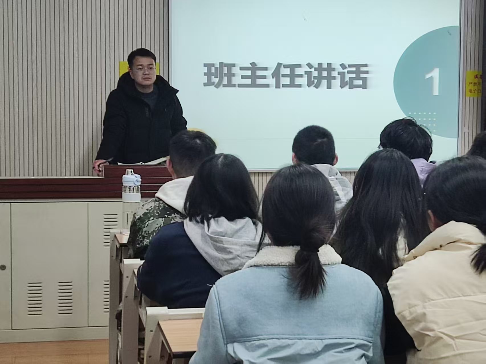 班会上第一项,班主任张家玮发言。他对班级上学期的整体成绩进行总结,肯定了同学们取得的进步,也指出存在的不足。同时,针对学业预警情况,班主任特别强调,希望同学们提高重视,合理安排学习时间,及时查漏补缺。