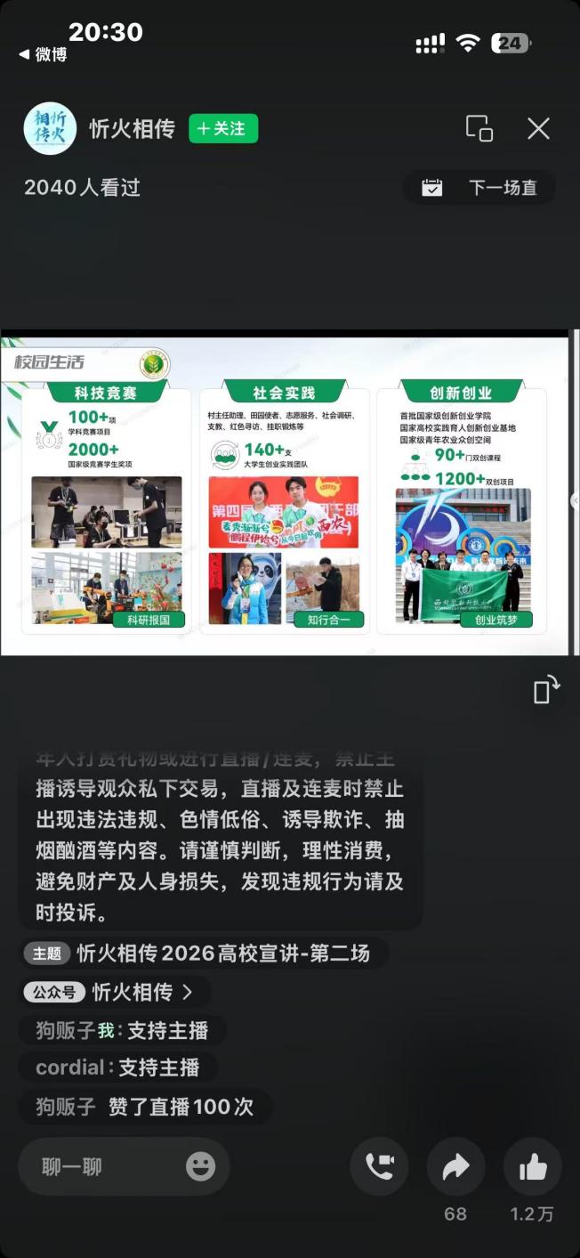 此次线上宣讲共开展多场,每场参与人数均突破2000人。宣讲队成员全程在线值守,依托PPT针对备考细节、志愿填报等问题倾囊相授,直播间互动热烈。不少学子表示,通过线上线下宣讲,既深入了解了西农实力,也收获了实用备考经验,坚定了圆梦名校的信念。